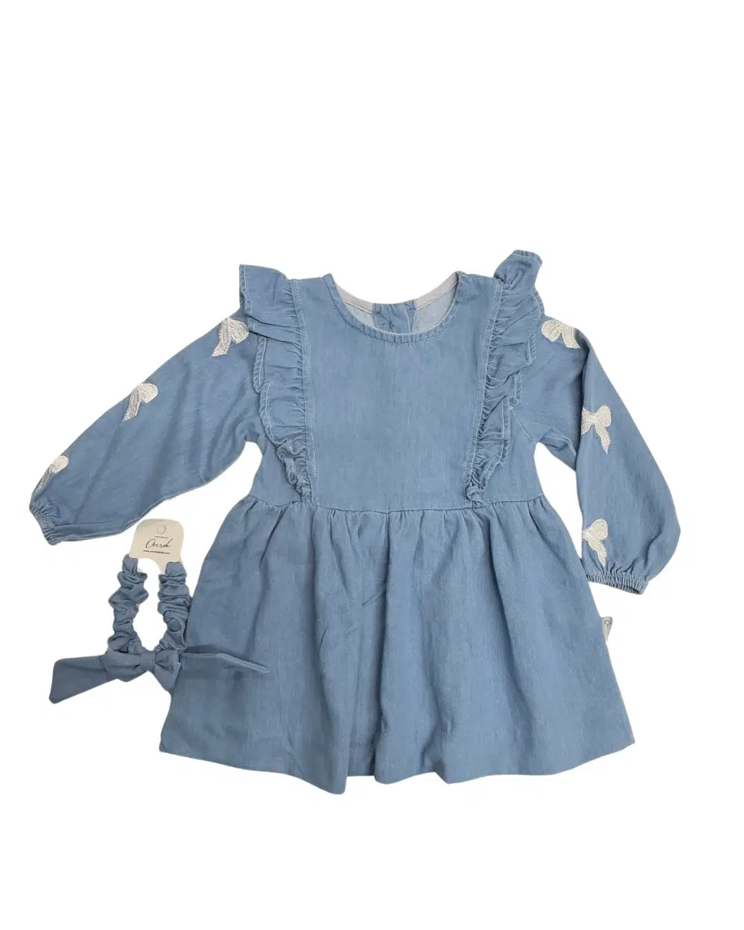 Bu elbise, sıradan kot elbiselerden ayrılan özel kurdele işlemeleri ile hareketlendirilmiştir. Yumuşak dokusu sayesinde çocukların hareket özgürlüğünü kısıtlamaz. Şık kesimi ve zamansız denim rengiyle her mevsime uyum sağlar; baharda tek başına, kışın ise renkli külotlu çoraplarla harika kombinler oluşturur.