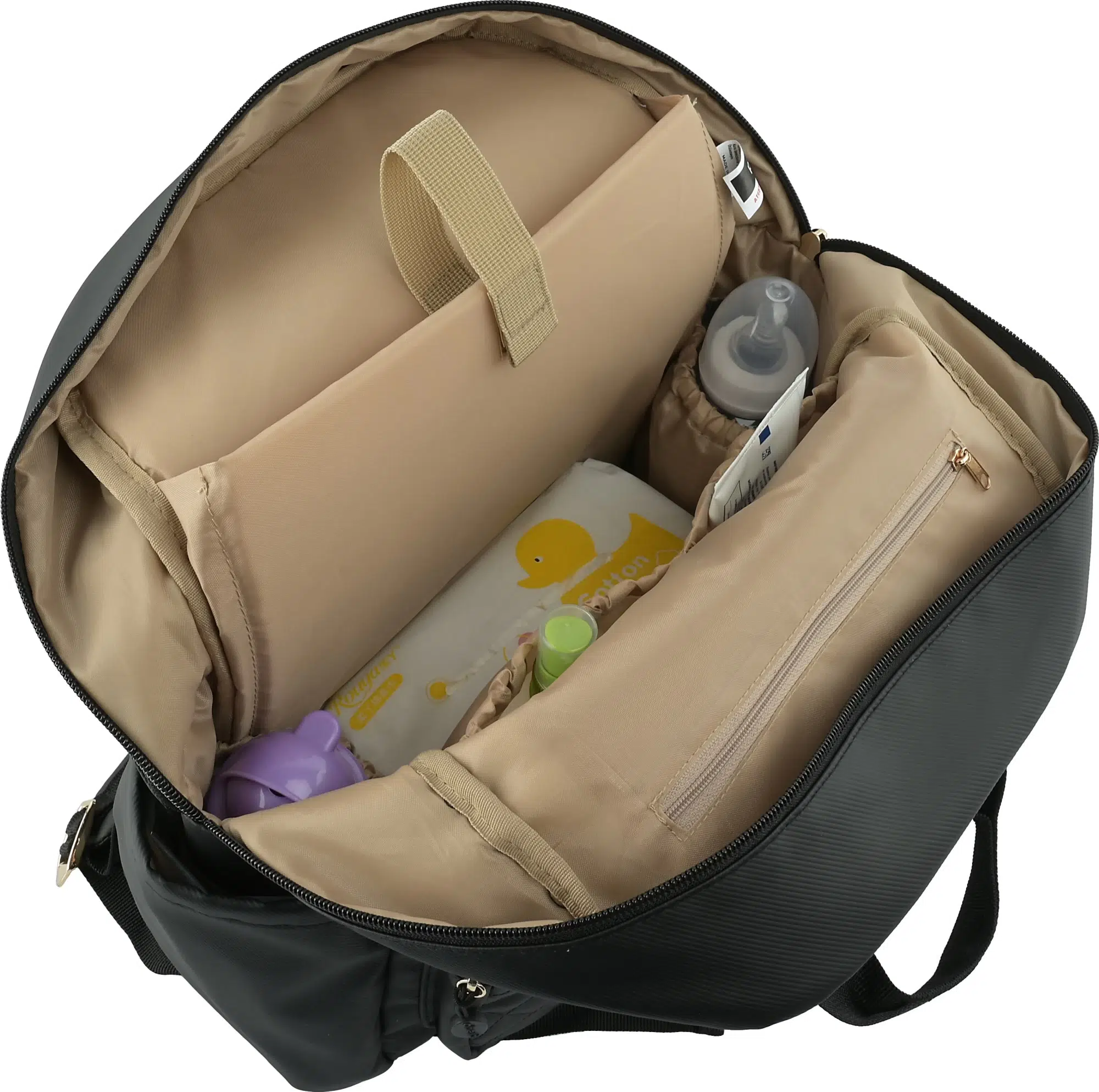 Üç ana bölümden oluşan geniş iç hacmi sayesinde bez, yedek kıyafet, biberon, oyuncak ve kişisel eşyalar düzenli şekilde taşınabilir. Çanta içerisinde biri fermuarlı olmak üzere birçok kullanışlı bölme bulunur. Sağ ve sol yanlarda yer alan lastikli gözler ise hızlı erişim gerektiren ürünler için ideal alanlar sunar.